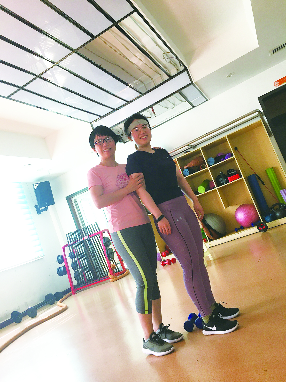 ◀罗小玲和女儿小天在健身房的合影。受访者供图