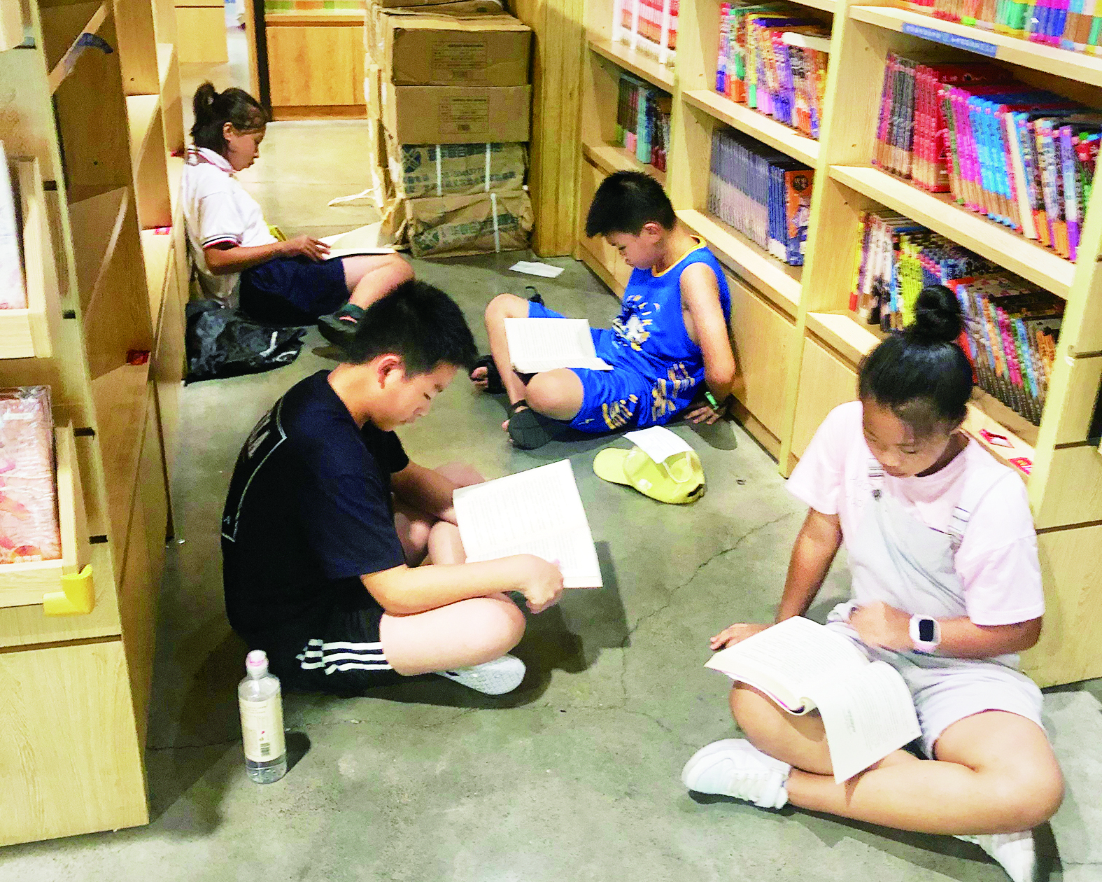 8月18日下午,记者走访了市新华书店(神农城店)、市图书馆、当当书店的少儿阅读区,发现书架中间、过道旁边,孩子们席地而坐聚精会神地阅读。