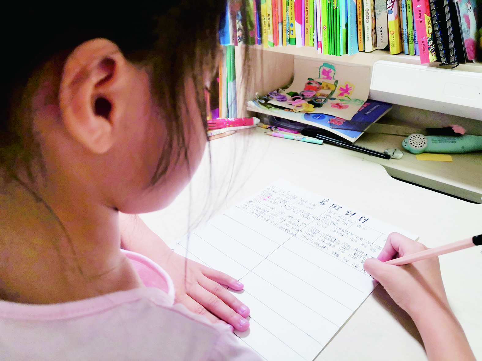 ▲一名小学生在核对自己的暑期计划。 记者/戴凛 摄