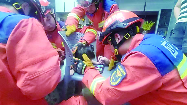 ▲消防员在破拆塑料凳。通讯员 供图