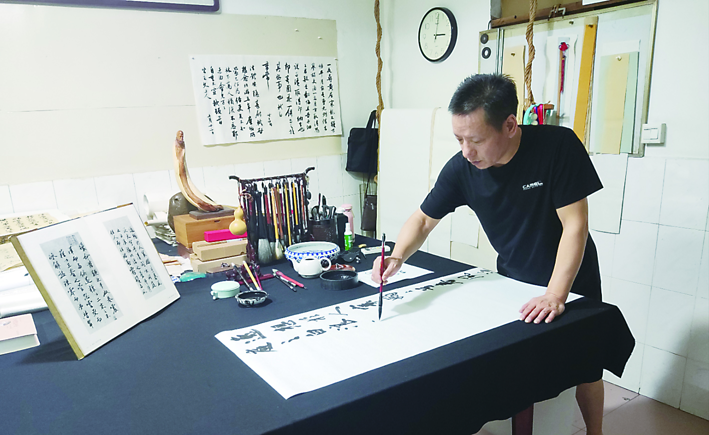 ▲王志良在工作室潜心练习书法。记者/肖星平 摄