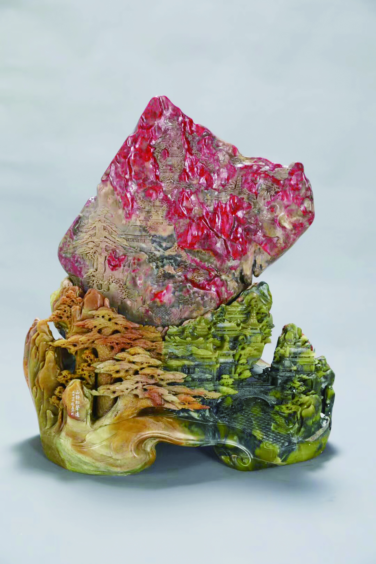 得益于雕刻实践以及中国美术学院的艺术理论进修,钱高潮在艺术道路上坚持理论和技艺的双线并进、相辅相成。学院派和民间派的结合是其创作的典型特点,也是其创作理念之宗。他认为要把美学、思想、人文、历史等元素渗透进作品中才能使创作有思想、有内容、有个性。钱高潮大师的创作题材非常广泛,历史人物、山水花草、鸟兽虫鱼等无所不及,尤以历史题材最为突出。他的这件玉雕作品《山静松声远》瑰丽、精巧、多姿,依血取巧,以血为宝。一眼望去,枫叶满谷,松涛阵阵,一派自然天成的秀丽画卷。作品既突出了鸡血石鲜艳的红色,又避开了石头上天然形成的瑕疵,让人在欣赏的同时有身临其境之感,耳边仿若听见令狐楚正在轻吟“山静松声远,秋清泉气香”。