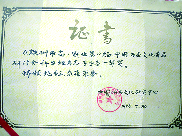▲《株洲市志·农业卷》获奖证书。 记者/廖智勇 摄