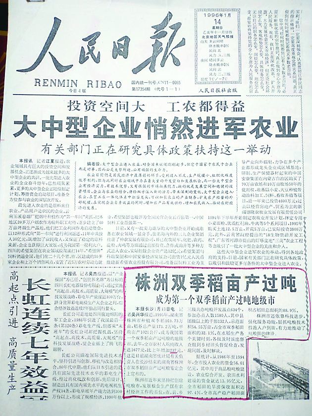 “1995年,湖南省株洲市种植双季稻173.2万亩,稻谷总产量173.2万吨,平均亩产1021公斤,成为我国第一个双季稻亩产过吨的地级市。”19日上午,原市农业局局长邹云享在家中拿出了珍藏多年的报纸,这是一份1995年1月14日的《人民日报》,他用红笔标注了株洲成为全国亩产成建制过吨地级市的新闻。