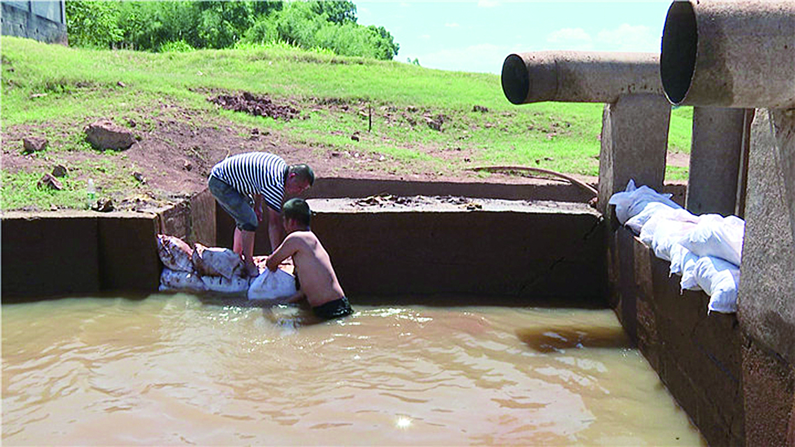 “如果不在半个小时之内修好的话,之前24个小时抽的水等于白抽了。”发现情况后,现场值守的龙船镇水管站站长李义祥立马带领石龙村村干部李红亮、马奇关停泵站,进行紧急抢修。40℃的高温下,马奇跳进浑浊的水槽里,将一袋又一袋10公斤重的沙袋扛在肩上,蹚过满是泥巴的浑水,将沙袋堆砌在引流槽入口。李义祥和李红亮默契地接过,将沙袋码放整齐、垒实。