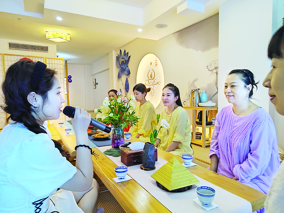 当天的禅茶心理沙龙讲座,8位顾客一身素裹围绕在茶台前互相分享着自己授课所得。