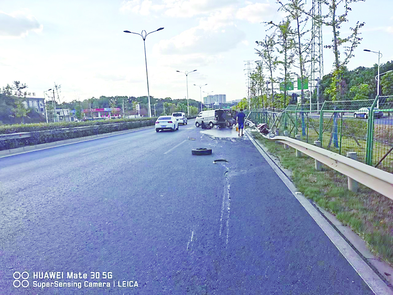 当天下午5时许,天元交警大队民警浣毅接到群众报警称,在湘江大道漫城段,有一辆货车发生侧翻事故,导致近百瓶食用油被压坏后洒满一地。浣毅立即带领辅警赶赴事发现场,只见由南往北的车道上,一辆微型货运车侧翻在最右侧车道上,护栏损坏严重。车上拖运的食用油被压坏后洒满一地。