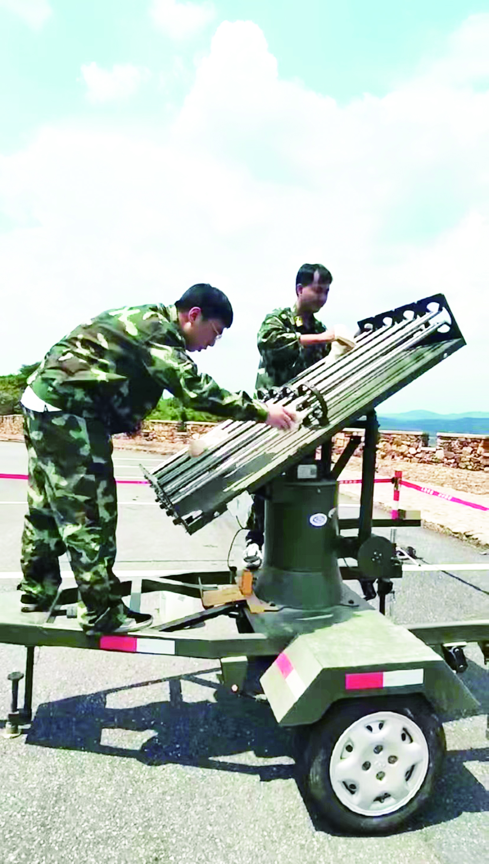 “准备,发射!”随着陈国平一声令下,队员按动发射开关,4枚火箭弹升空。5分钟后,雨水大珠小珠落玉盘。