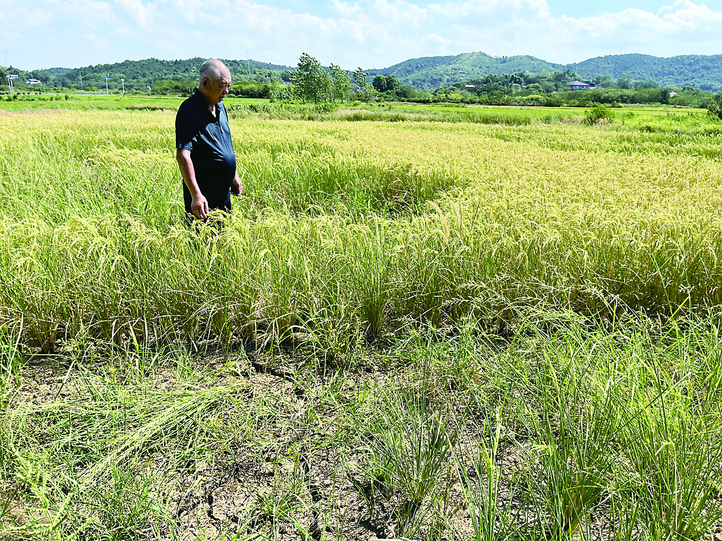 稻穗发白、禾叶卷缩、土地开裂、引水渠干涸……25日上午,63岁的村民凌桂华带着记者来到位于东园村兴旺组的稻田查看情况。