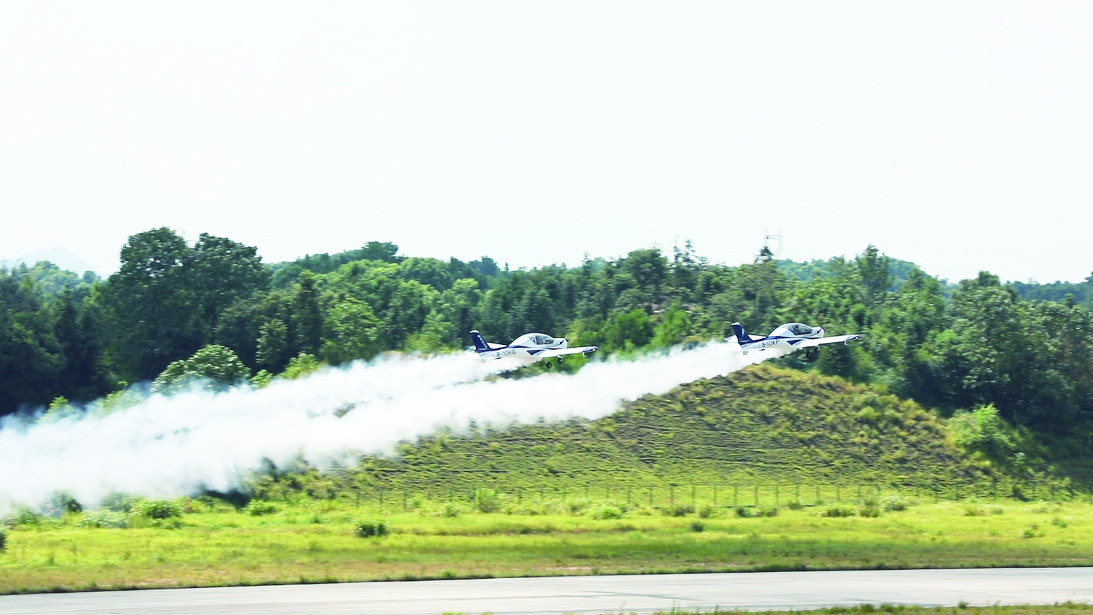 ▲山河飞行表演队的阿若拉S60L飞机正在进行编队训练。记者/廖威 摄