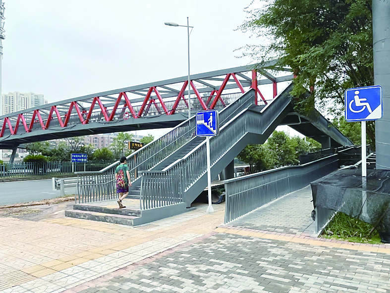 本报讯(株洲晚报融媒体记者/刘平)8月29日,位于天元区炎帝大道与栗合路交叉路口处的市二中附小人行天桥面向市民开放通行。两条无障碍坡道因路面正在绘制彩绘作品暂缓通行,市民通过梯道上下人行天桥。