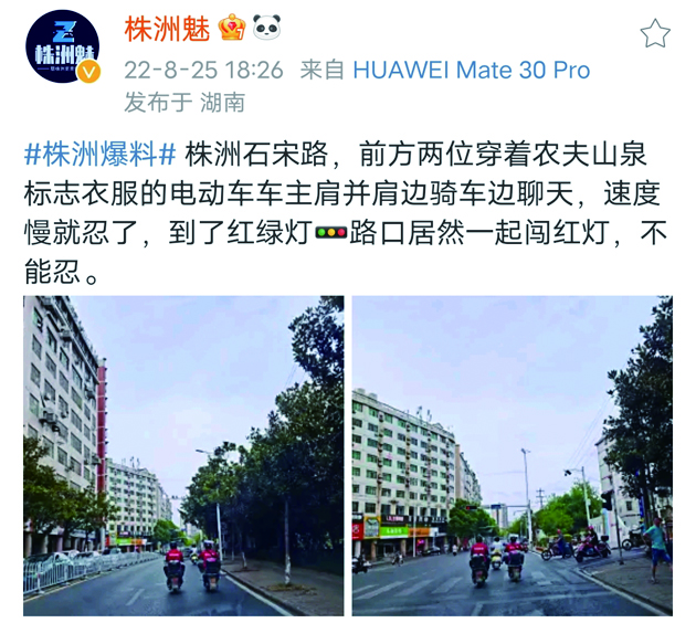 株洲石宋路,前方两位穿着农夫山泉标志衣服的电动车车主肩并肩边骑车边聊天,速度慢就忍了,到了红绿灯路口居然一起闯红灯,不能忍。