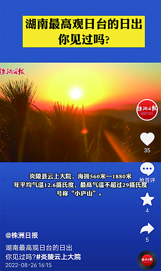 炎陵县云上大院,海拔560米—1880米,年平均气温12.6℃,最高气温不超过29℃,号称“小庐山”。每年暑期,许多游客来这里看云海、观瀑布,避暑纳凉。这里的玄天观日台,是湖南最高的观日台,海拔1740米,比南岳还高500多米,吸引不少游客打卡。炎炎夏日,在这里看日出,体会就三个字:高、冷、美!