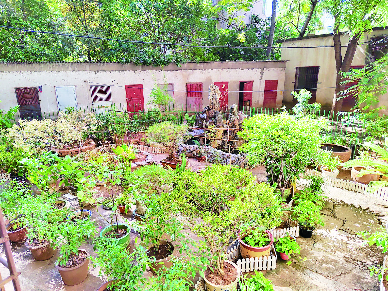 记者来到尹女士家的后院,其打造的绿色“微景观”中既有假山流水、又有绿植相伴,与院落其他规整不平的“黄土坡”形成鲜明对比。