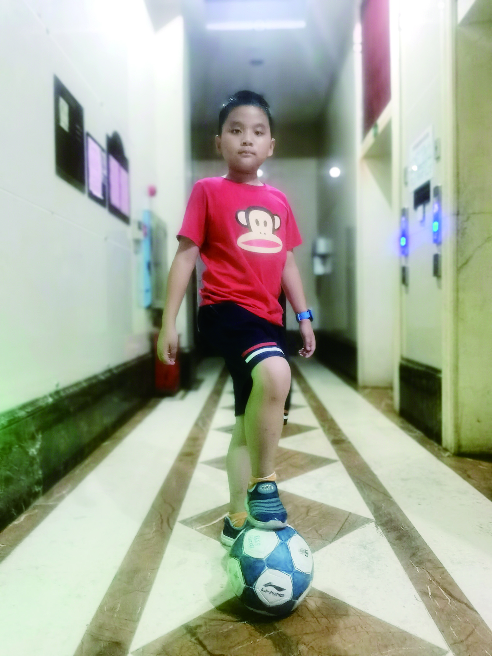 训练过程中,瞿教练每天都先带着我们跑步,进行简单热身,再完成一些基础训练,如跨越障碍物等。瞿教练每节课都会耐心细致地为我们讲解足球技巧和动作要领,我听得十分认真,练习也特别投入。经过训练,我熟练掌握了一些基本功动作,如脚底后拉球侧拨、双脚交替踩球、脚尖拉球、双脚侧拉球、外脚背带球等。熟练掌握这些动作后,我发现我的平衡能力、灵敏性、控球能力、灵活性有了显著的提高。