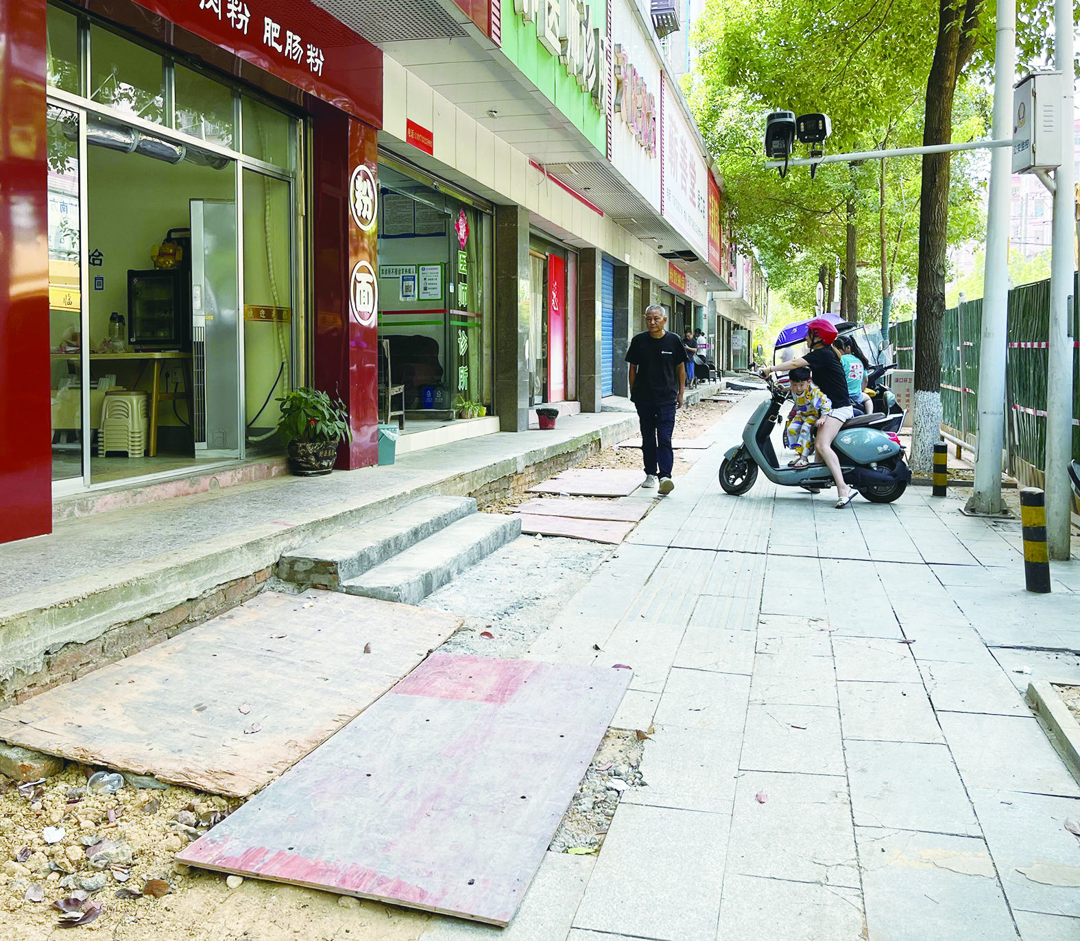 “沿线商铺受此影响生意锐减,一些门面直接关门了。”商户张松林介绍,他租有2个门面,自人行道施工以来,上下台阶非常不方便,进店的顾客明显减少。