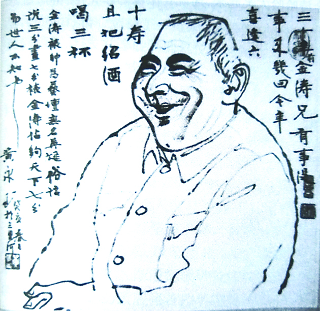 一日,刘金涛从华君武家出来直奔黄永玉家,黄永玉因思友心切遂直言道:“过去我住东城,你住西城,有事没事常来串门,而今你住东城我住西城,一年也见不到你几回了……”黄永玉一面埋怨,一面从酒橱里取出一瓶绍兴花雕来,然后又摆出花生米、牛肉、干鱼片等几碟下酒菜,二人边喝边聊,黄永玉突然问道:“你今年六十了吧?祝你长寿,干杯!”两人连喝几杯,黄永玉兴奋地说:“今日你来得正好,我要为你画张寿像,祝你六十大寿!”刘金涛高兴地说:“好!我来磨墨。”一袋烟的工夫,黄永玉把刘金涛的特点:由于职业的长期修炼,见人面带几分微笑,和和气气迎顾客的特征充分地表现出来。画完,遂题诗一首:“三十年前金涛兄,有事没事来几回。今年喜逢六十寿,且把绍酒喝三杯!”题罢意犹未尽,接着他又挥毫写了一段艺评:“金涛裱师为艺坛无名英雄。俗话说,三分画,七分裱。金涛占够天下七分而世人不知也(王立道《装裱名师刘金涛》)。”