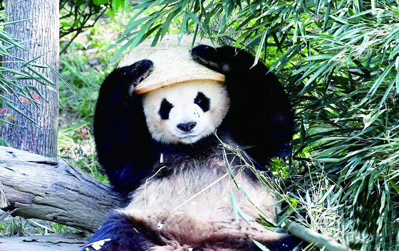 ▲大熊猫“芝麻”在成都大熊猫繁育研究基地兽舍里给自己戴了顶“帽子”,好像在模仿《功夫熊猫》里的阿宝,“芝麻”是成都大运会吉祥物“蓉宝”的原型。
