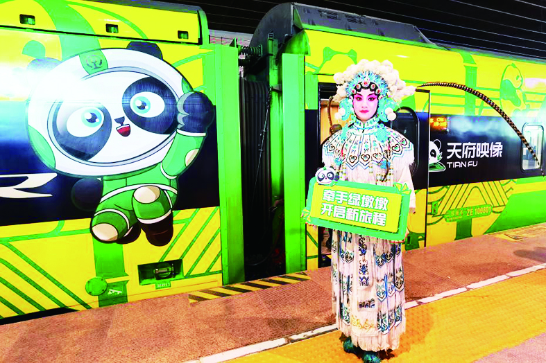 ◀巴蜀文化为主题涂装的动车组“天府映像”列车正式上线运行,列车融入大熊猫、盖碗茶、川剧脸谱以及太阳神鸟、三星堆面具等文化元素,展示巴蜀地域文化特色和人文底蕴。
