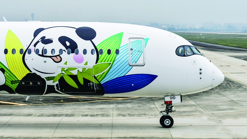 ▲成都双流机场,四川航空熊猫彩绘A350飞机准备起飞。