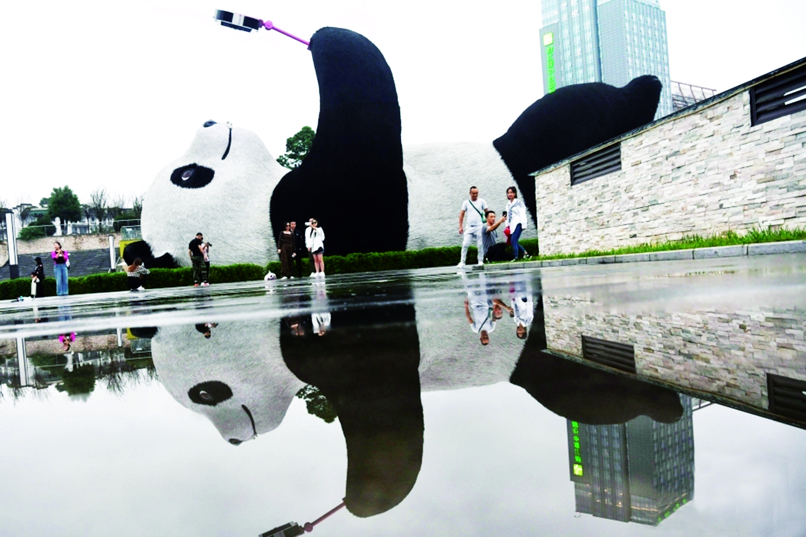 ▲位于四川省都江堰市仰天窝广场的自拍“大熊猫”吸引各地游客参观,这只“大熊猫”由荷兰艺术家费洛伦泰因·霍夫曼设计。