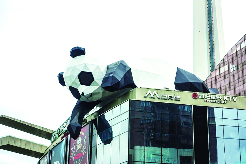 ▲天府熊猫塔旁的339购物中心楼顶,一个熊猫装置趴在房顶。行走在这里,一抬头就能收获惊喜。