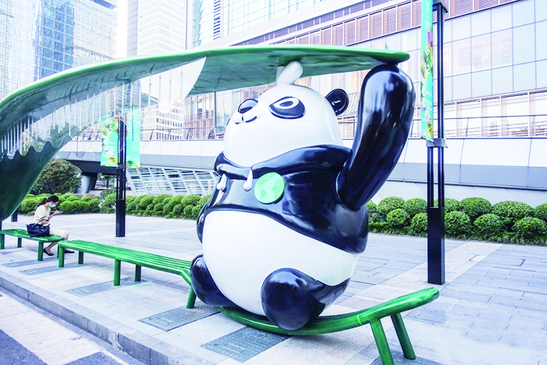 ▲成都纱帽街一座大熊猫主题公交站,风里雨里阳光里,它都坐在你身边,陪你等车看风景。