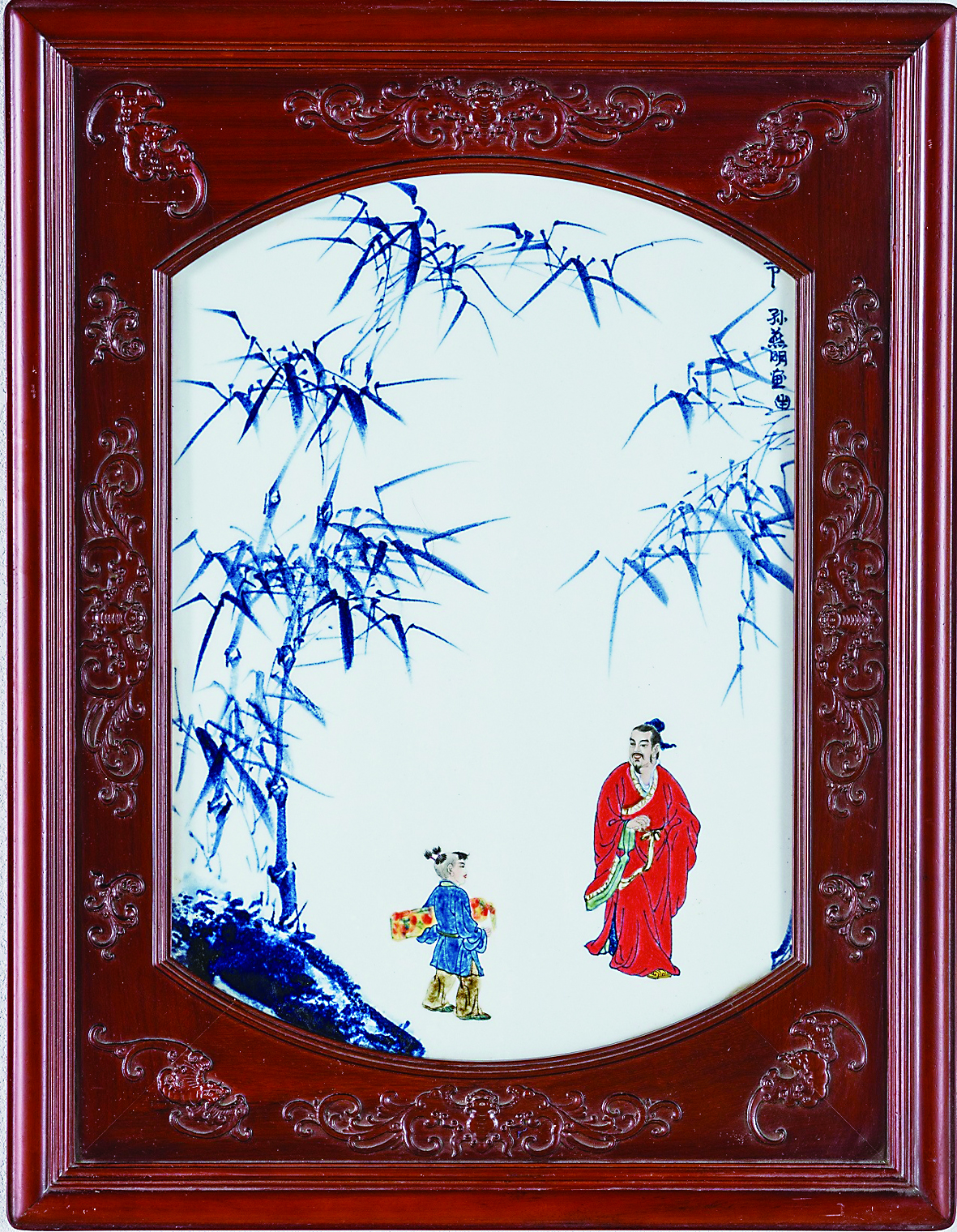 《青花斗彩瓷板人物》中的人物形神兼备,人物的服饰、动作、气质等外在及内涵均体现了中国古画的韵味。并且在瓷板画上,融入雕塑手法,让瓷板更显立体感。