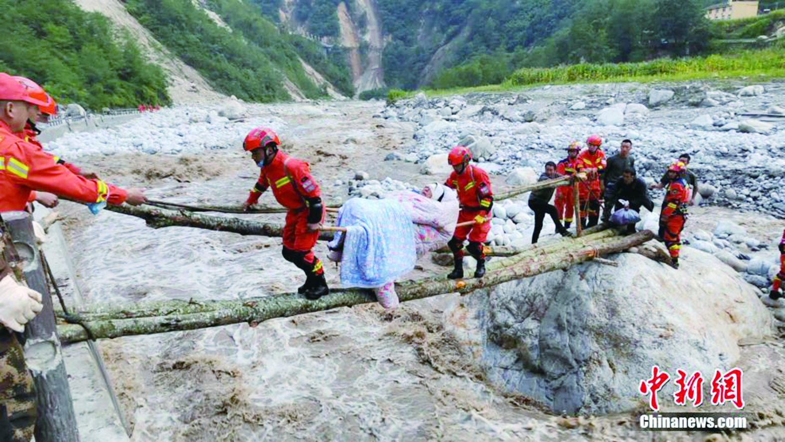 ▲森林消防员抬着受伤群众过河。四川森林消防供图
