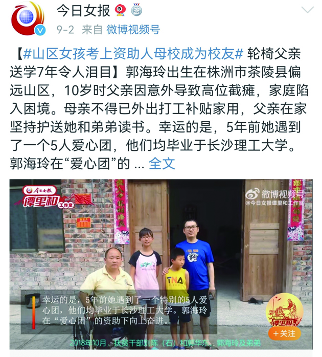 郭海玲出生在茶陵县的偏远山区,在她10岁时,父亲因意外导致高位截瘫,家庭陷入困境。幸运的是,5年前,她遇到了扶贫干部刘陈,刘陈发动4位长沙理工大学的同学组团资助女孩。成绩最开始还平平的郭海玲在爱心团队的鼓励和帮助下奋发图强,在今年高考中取得了优异的成绩,如愿考上了这5位爱心人士的母校——长沙理工大学。