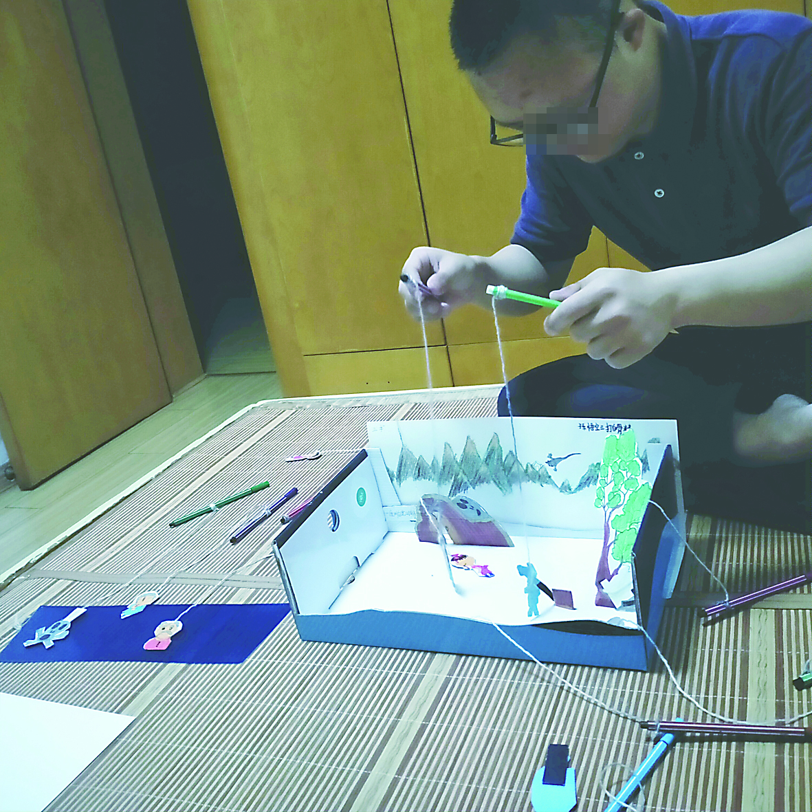 ▲宏俊正在为妈妈表演人偶剧。受访者供图