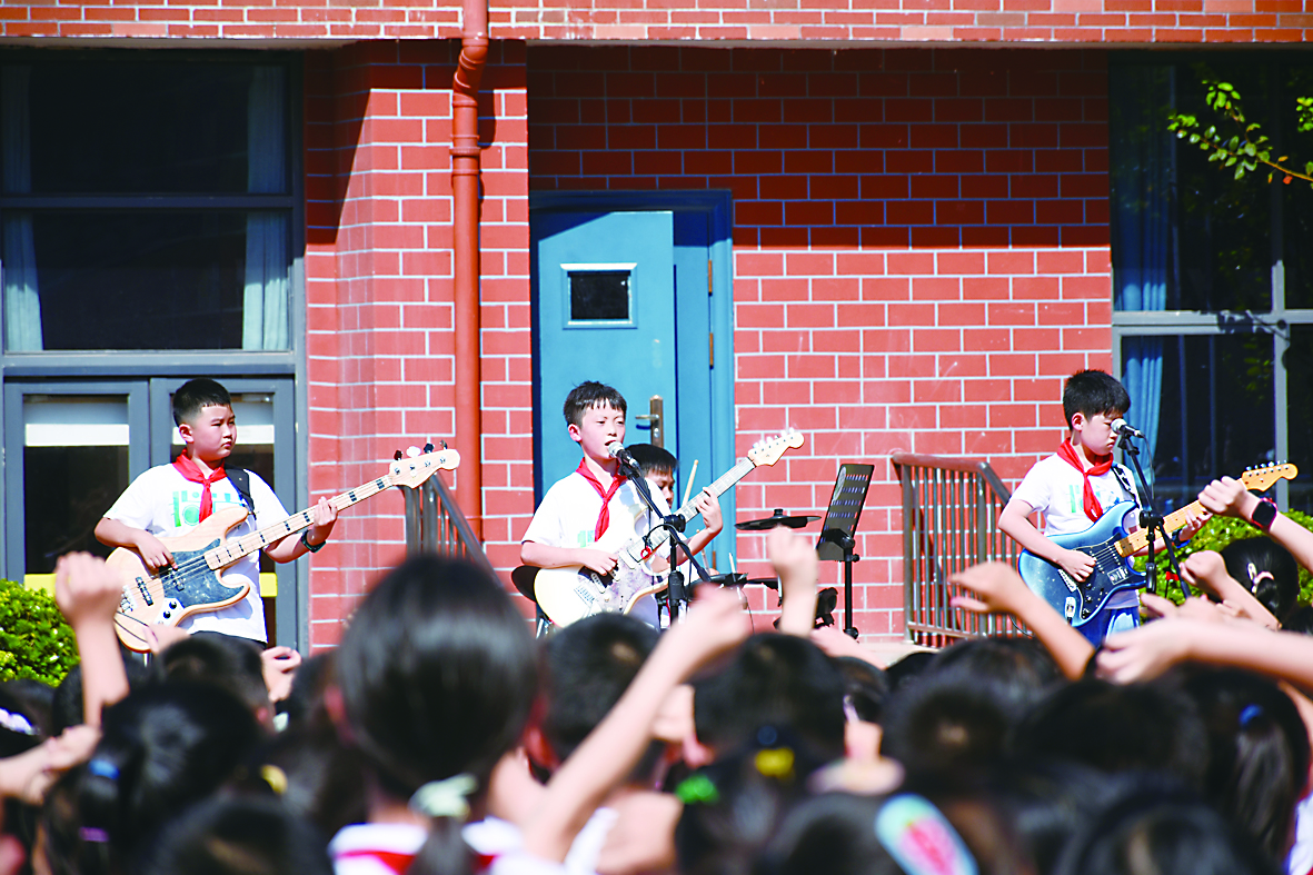 本次课间音乐节邀请到株洲市指尚现代音乐中心的“YYDS”乐队,演出曲目有《我说了算》《孤勇者》《小城夏天》。整场演出气氛热烈、高潮迭起,同学们一同歌唱,歌声、掌声、欢呼声交织在一起,让现场变成了音乐的海洋。在浓厚的艺术氛围中,学生们感受到了音乐的魅力与乐趣,充分展现了凿石小学“双减”教育的新成果、新气象。