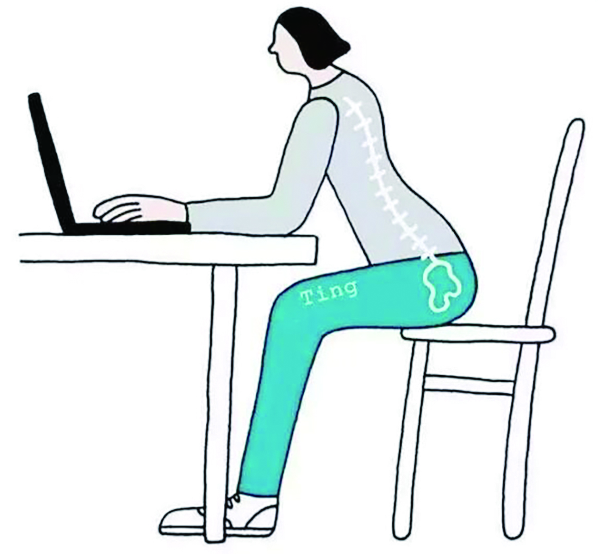 第三类是“驼背坐姿”,坐着时勾背、含胸,脖子向前伸,这类坐姿会导致富贵包、肩背痛、腰痛。
