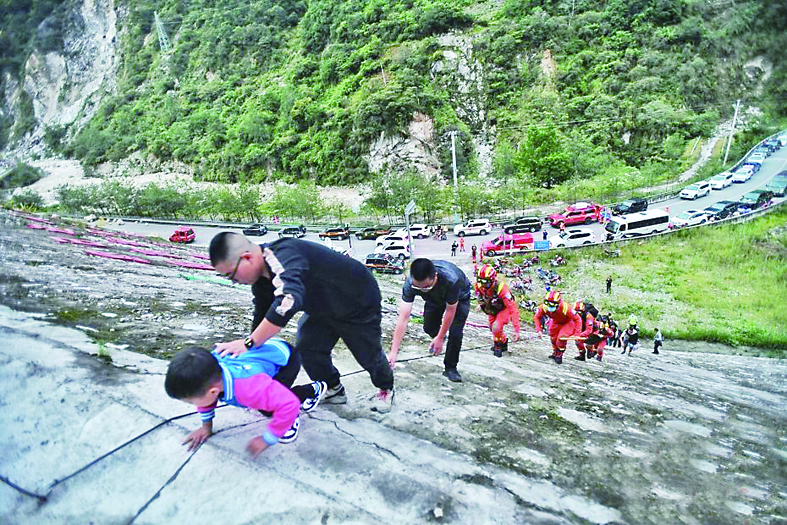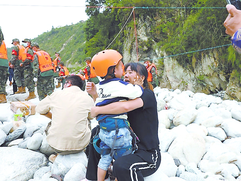 逢山开路,遇水搭桥。山体垮塌致道路中断,救援人员或背或抱或扛或抬,转移伤员和受困民众;被湍急浑浊的河水阻拦,救援人员就用身体、绳索、木材搭建生命通道;只能载4人的橡皮艇,连夜在大渡河来回往返,运送救援人员挺进受灾更为严重的地区……