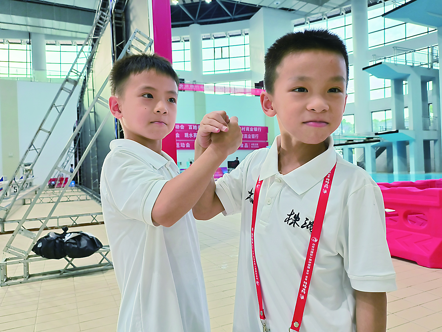 ▲“三金”运动员马靖轩(右)与“三银”运动员艾志洋在省运会上“一时瑜亮”。记者/温琳 摄