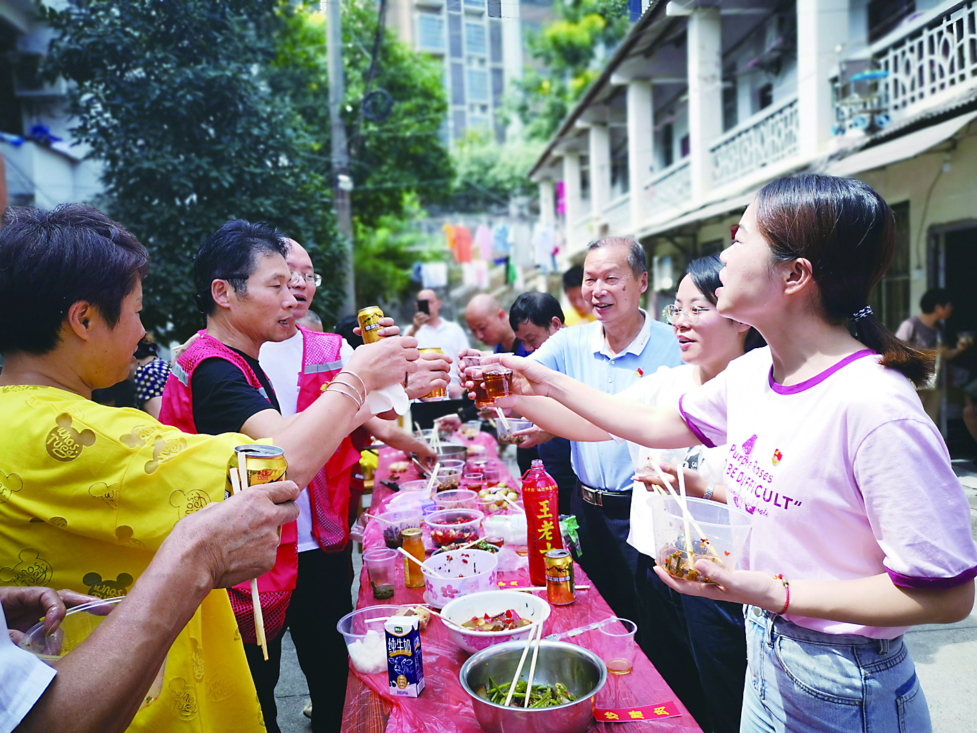 月饼、水果、饮料、红烧猪蹄、白辣椒炒肚丝、坛香肉、浏阳手工笋尖……9月9日,芦淞区龙泉街道荷叶冲社区荷叶三村小区,居民以一场百家宴迎接中秋佳节。大家拼出数十米长的餐桌,各家端出点心和热气腾腾的拿手菜摆上餐桌,共享和谐之乐。
