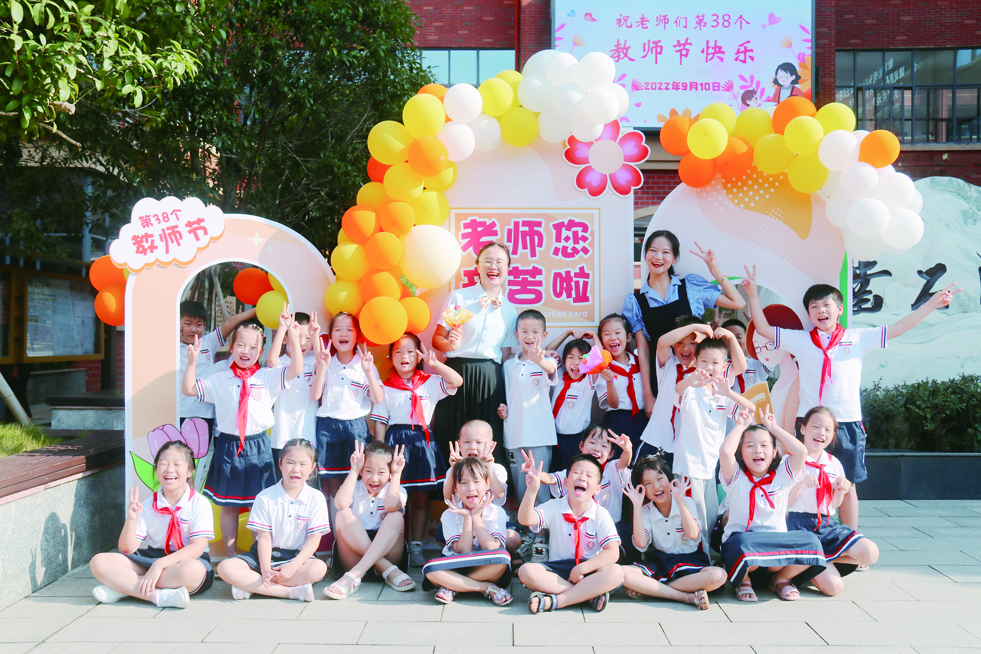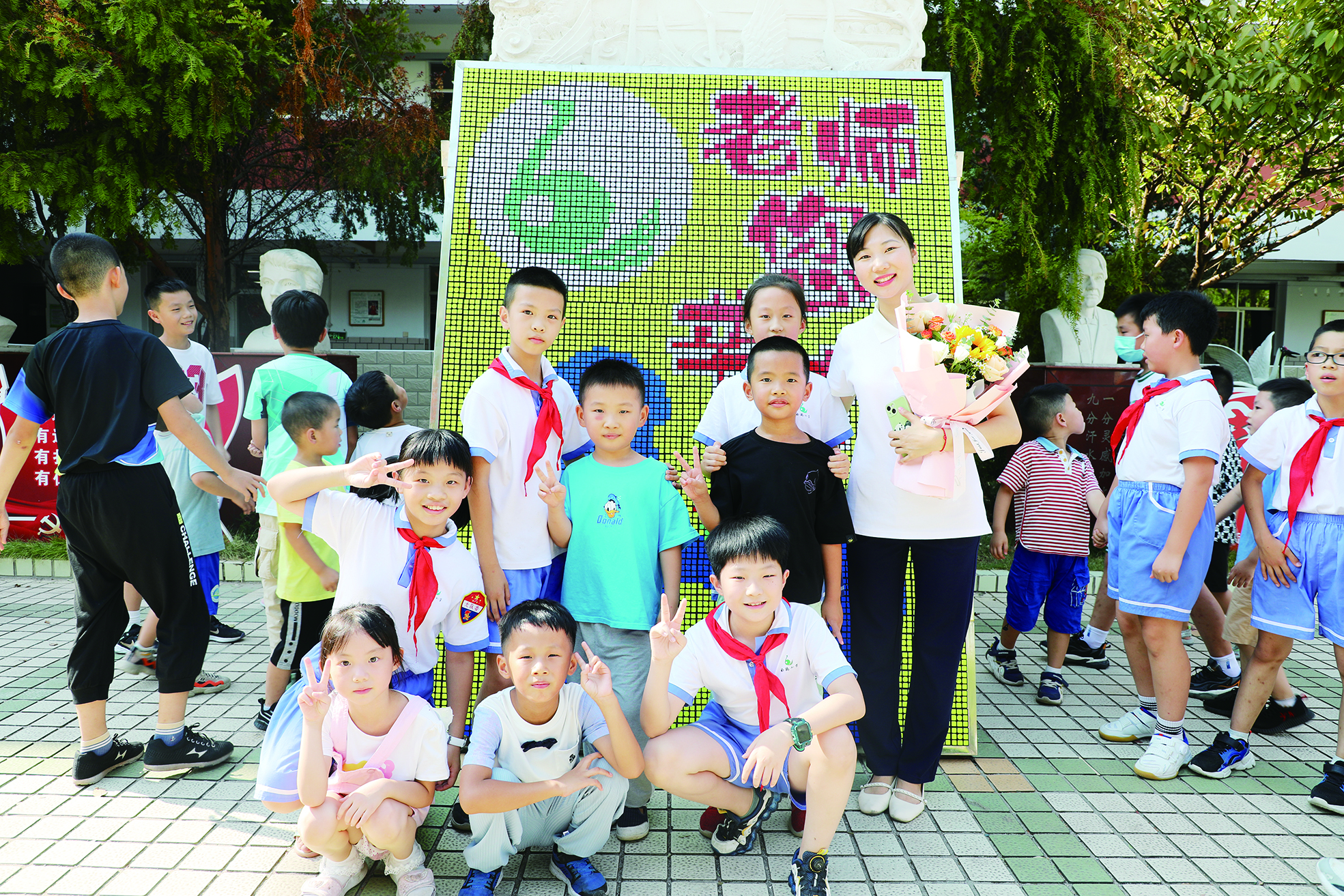 ◀9月9日,天元区白鹤小学举行“喜迎党的二十大 培根铸魂育新人”教师节系列庆祝活动。早晨,学校全体行政人员在校门口迎接教师到校,并送上贺卡、福袋。同学们也准备了各种手工制作的精美小作品,为老师送上节日祝福。 株洲晚报融媒体记者/孙晓静 通讯员/邹慧霞 易文归 摄