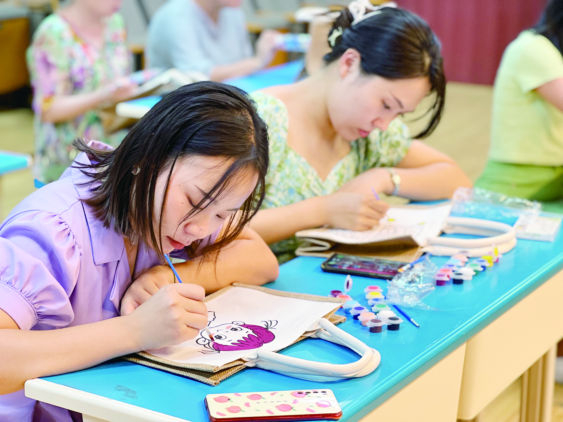 ◀9月9日下午,天元区泰山学校为全体教师举行“缤纷校园缤纷绘”手工绘制环保袋活动,让老师们在繁忙的工作之余,通过画笔放松心情,收获属于自己独特的作品。 株洲晚报融媒体记者/孙晓静 通讯员/徐芳 摄