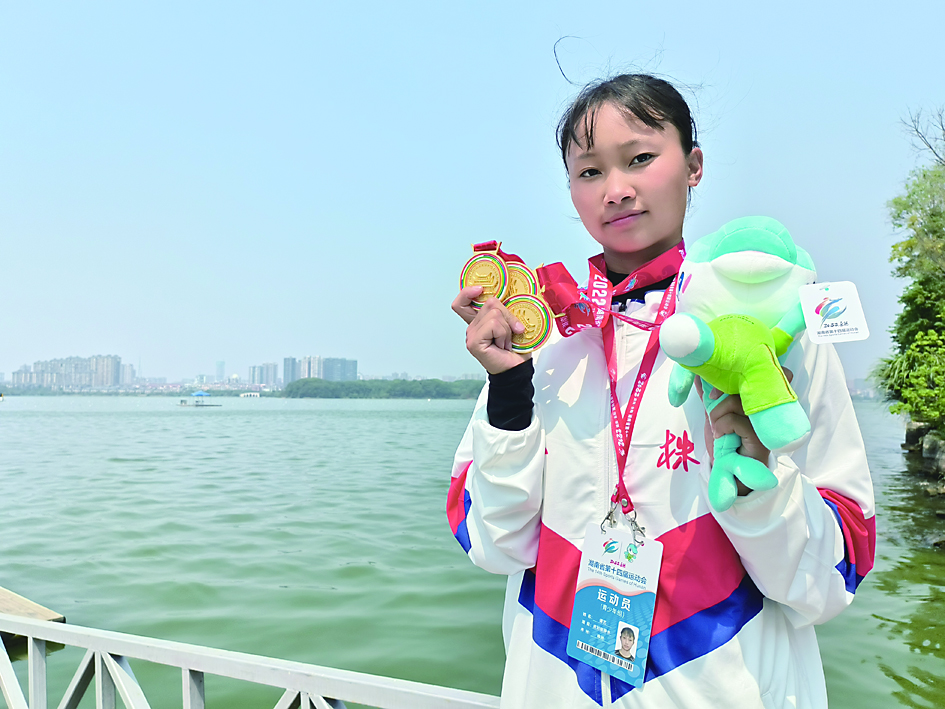 ▲18岁的谭艺成为省运会上株洲第二位“三金”选手。 记者/温琳 摄