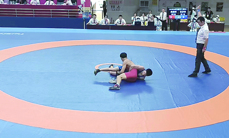 ▲株洲摔跤小将(红方)在赛场上奋勇拼搏。 记者/温琳 摄