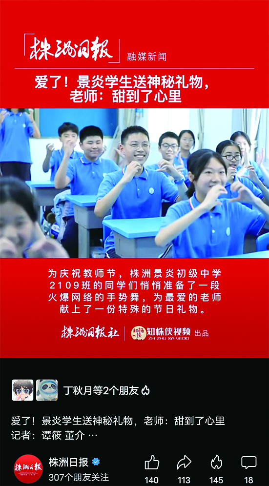 为庆祝教师节,株洲景炎初级中学2109班的同学们悄悄准备了一段火爆网络的手语舞,为最爱的老师献上一份特殊的节日礼物。