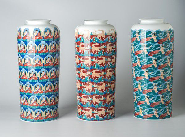 ◀钟放平的《致敦煌》系列(从左至右,分别为《致敦煌》系列之佛、九色鹿、飞天)。 网络供图