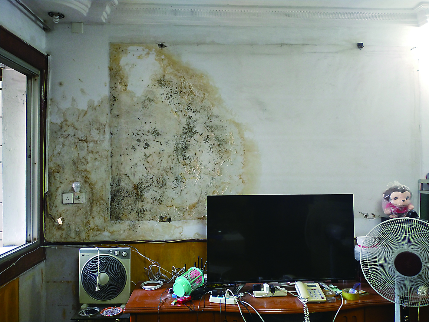 ▲李大爷家电视背景墙大面积渗漏发霉。记者/廖智勇 摄
