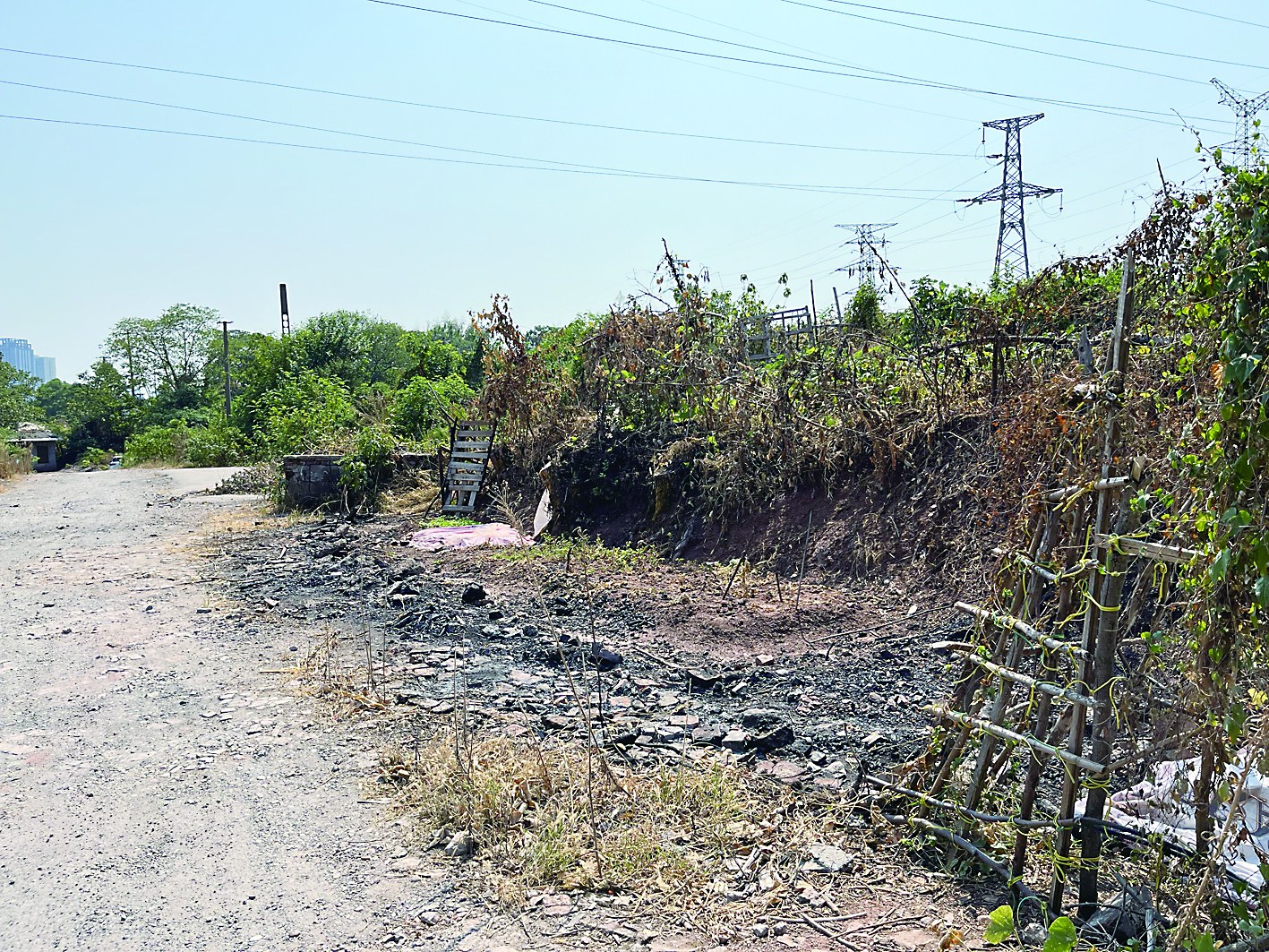 ▲铁路边,有植被被烧焦。 记者/刘平 摄