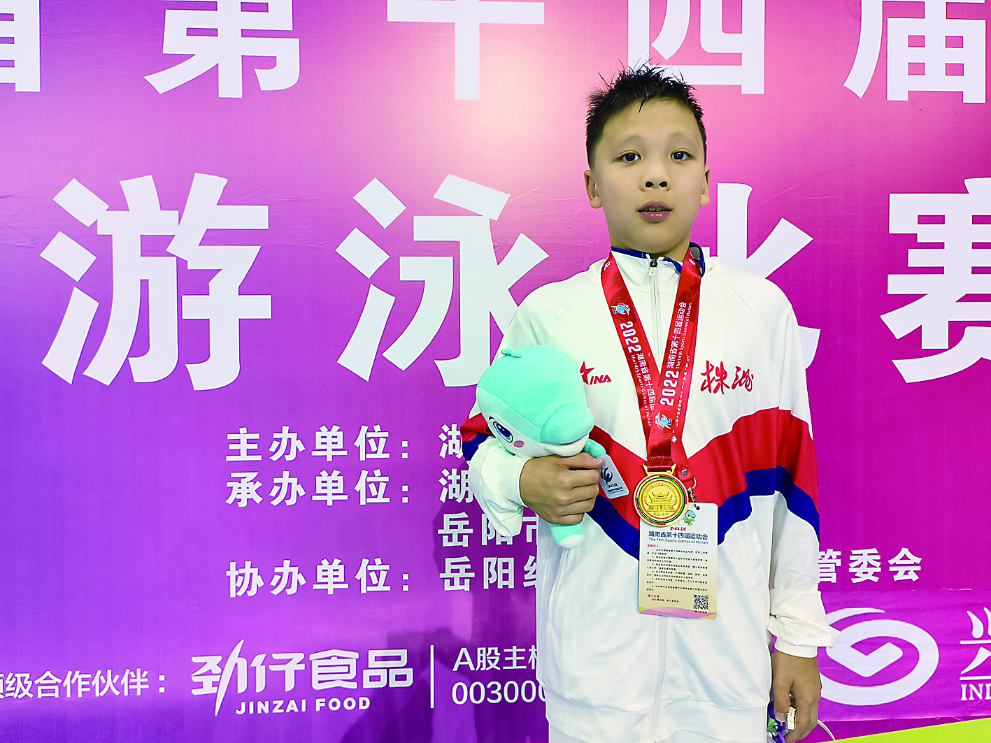 ▲11岁游泳小将宋泯臻夺得株洲体育代表团第50金。记者/温琳 摄