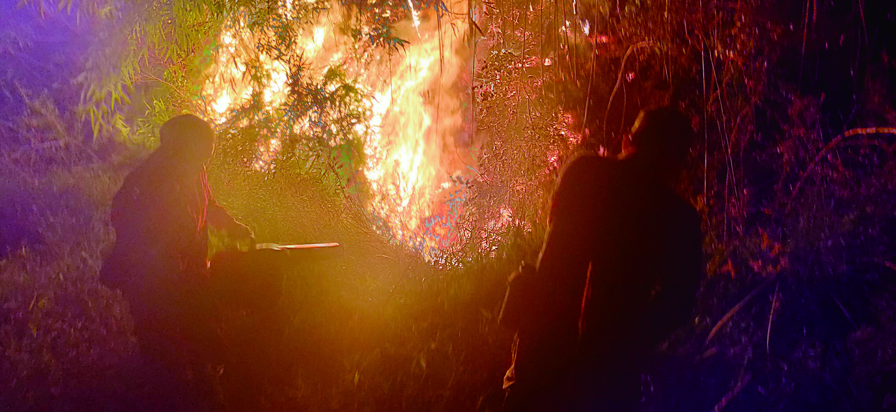 大家手提风力灭火机,强势压住火势。然而,不知是谁喊了一声:“上面又烧着了!”
