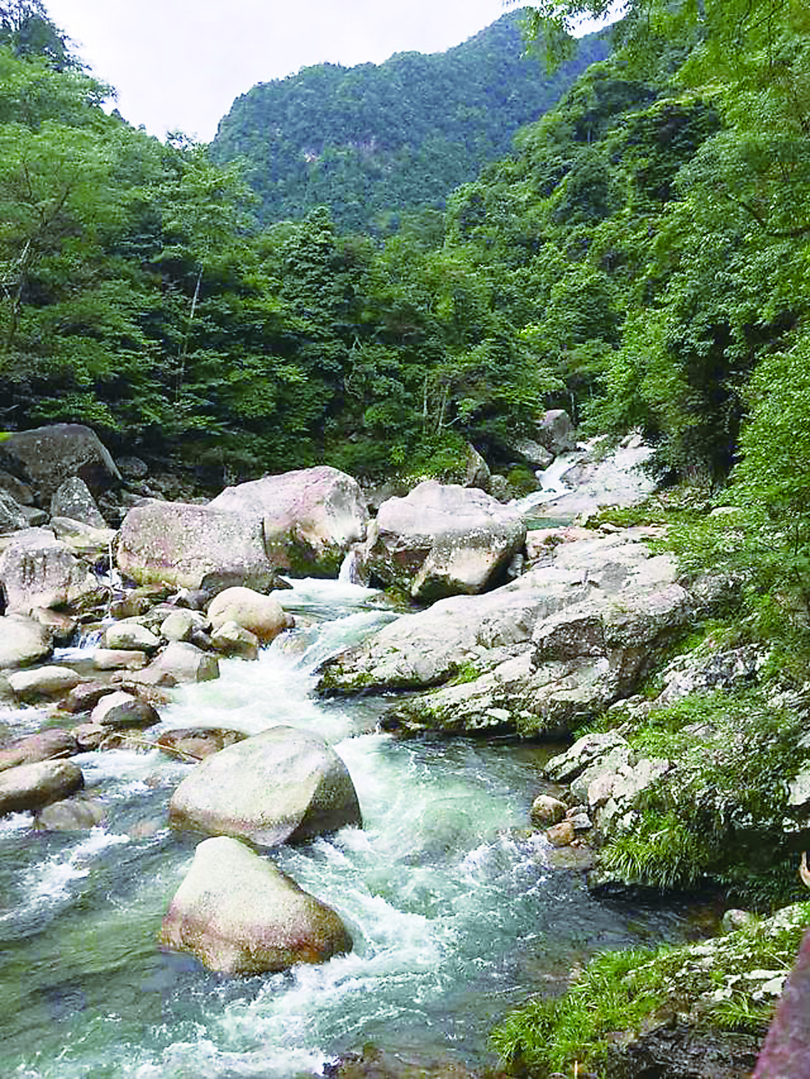 石块堆积的地方,水便十分湍急,湍急之处的水就像一团无污染的飘飘白云,像小朋友吃的软软棉花糖。但它不一样的地方在于,看起来绵绵软软,但其实却坚硬得不能触碰,这就是水的力量。