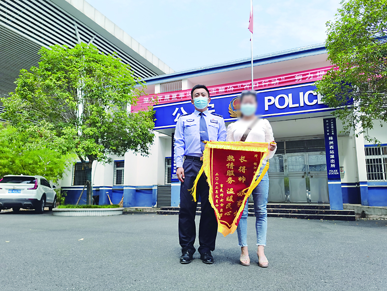 本报讯(株洲晚报融媒体记者/肖蓉 通讯员/盘国元 周德华)近日,株洲西站派出所民警朱鹏收到一面感谢锦旗,上面写着“长得帅,办事快,热情服务,温暖民心”。失主邓女士欣喜万分地说:“幸亏民警帮忙寻回行李箱,让我顺利参加了亲友婚礼。”
