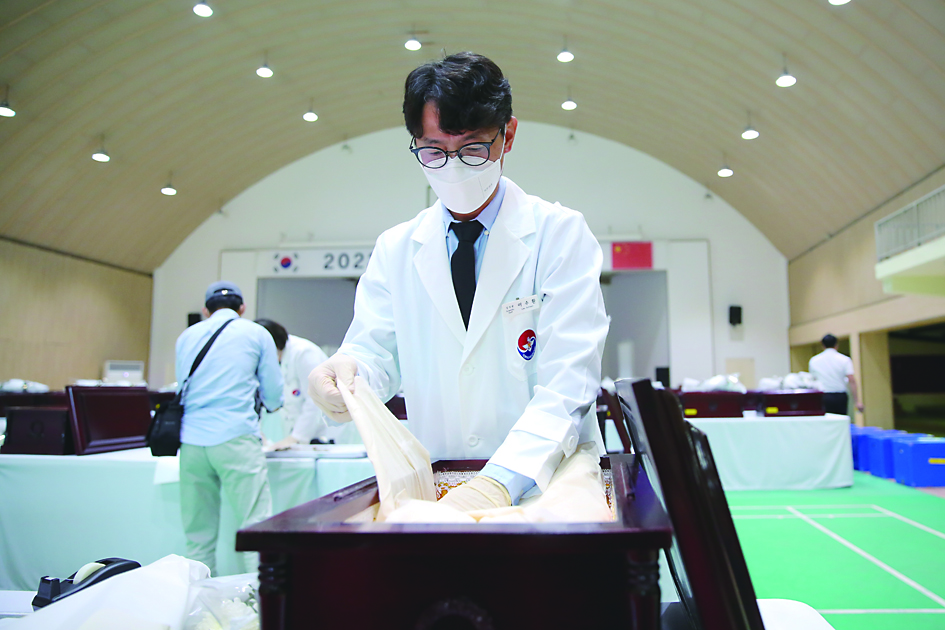 第九批在韩中国人民志愿军烈士遗骸装殓仪式9月15日在韩国仁川举行。据有关方面介绍,此次韩方将向中方送还88位烈士遗骸及相关遗物。9月16日,第九批在韩志愿军烈士的遗骸将回到祖国的怀抱。图为当日在韩国仁川韩方工作人员将志愿军烈士遗骸入殓。 新华社记者/王益亮 摄影报道