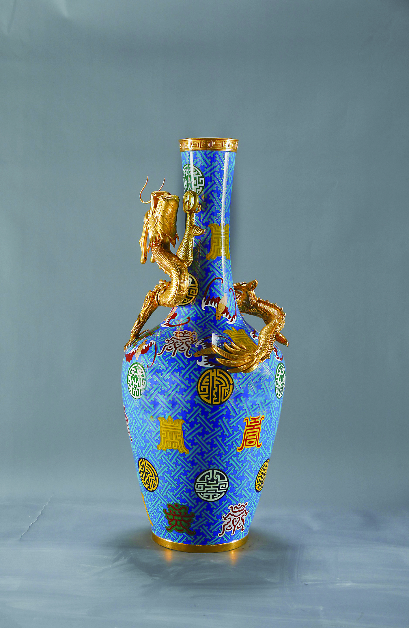 景泰蓝,中国的著名特种金属工艺品之一,到明代景泰年间这种工艺技术制作达到了巅峰,制作出的工艺品最为精美而著名,故后人称这种金属工艺为“景泰蓝”。 《仿清乾隆景泰蓝龙纹瓶》作为国务、政务礼品类作品于2005年荣获第二届中国礼品设计大赛金奖。整体外观晶莹润泽,鲜艳夺目。作品造型比例协调,上细下宽,线条流畅,主体蓝色与金色搭配,庄重典雅,又富有活力。瓶颈处饰有立体盘龙,龙头朝上,苍劲有力。瓶身上饰有不同字体的“万”字与“寿”字纹,极具中国传统文化之韵味,有祝福之意。